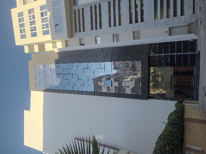 The image depicts an exterior street-level view of multiple buildings in an urban setting in Meknes, Morocco, under a clear blue sky. The central subject is a multi-story building featuring a prominent, reflective dark glass curtain wall running vertically through its center from the ground floor upwards. This glass facade reflects elements of a building across the street, including windows and a reddish roofline. The lower section of this central facade incorporates a recessed glass entrance, revealing double wooden doors behind it. The areas immediately adjacent to the glass facade on the lower levels are clad in dark grey or black panels accented with thin horizontal light-colored strips. Portions of the building above these sections appear light-colored. To the left, a section of a plain, light-colored (white) building wall is visible. A large green palm frond partially obscures the upper left corner. At the base of this wall, a manicured green hedge grows behind a low, light-brown concrete wall or planter box. To the right, an adjacent multi-story building, also light-colored (white), displays multiple windows on its upper floors and horizontal architectural features resembling slit-like openings on its lower floors. A light-colored door is situated at ground level, accessed by a small flight of concrete steps. The immediate foreground consists of a grey, paved surface. No individuals or vehicles are present in the scene.
