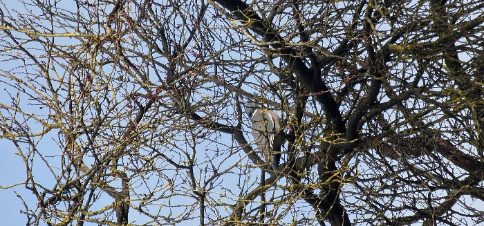 A grey bird, possibly a pigeon or dove, sits amidst the dense, bare branches of a tree against a light blue sky. The branches are covered with yellow lichen or moss, and some have small red buds. The bird is perched on a branch towards the center of the frame, partially obscured by the network of twigs and branches. The overall composition is complex, with the interlacing branches creating a textured and intricate pattern.
