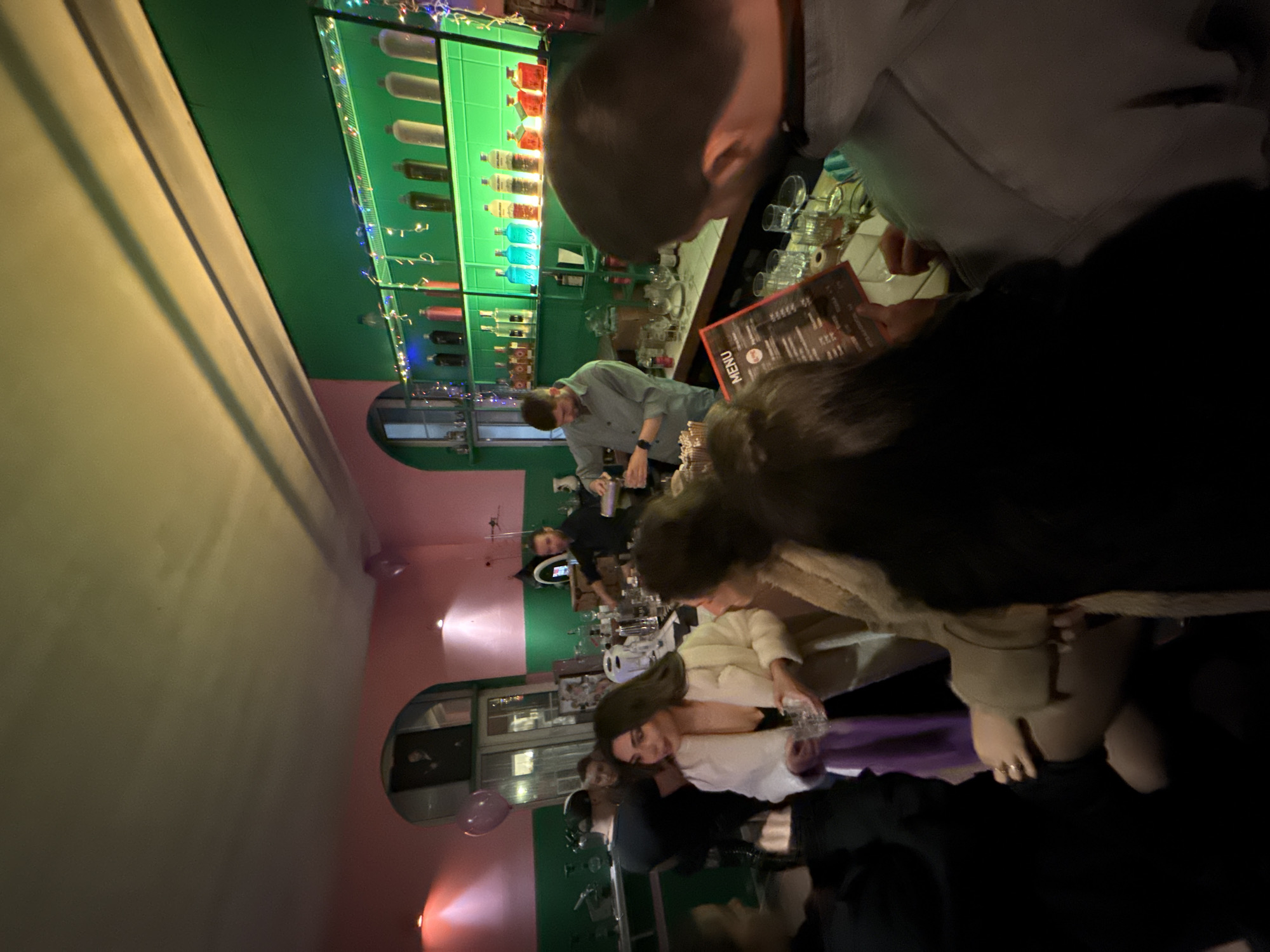 bar in Sofia, Bulgaria. Patrons are seated at the bar, interacting with the bartender. The bar is well-lit with a green and pink color scheme. Bottles are displayed on the back wall of the bar. Patrons are looking at the menu. Some people are standing while others are seated. A person is holding a glass. The bar has a modern interior with a unique design.
