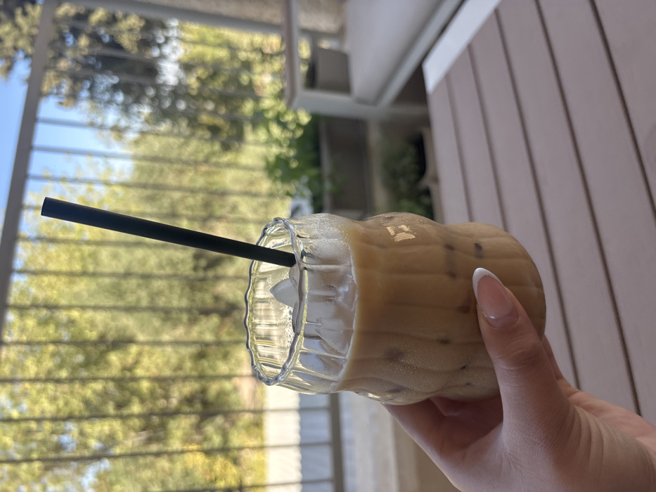 The image depicts a close-up, outdoor scene located in Maale Adumim, Palestinian Territory, likely on a balcony or patio. The primary subject is a clear, rippled glass holding an iced coffee beverage with a black straw. The glass contains a light brown, milky liquid with numerous ice cubes visible, some partially melted, and condensation on its exterior. A left hand, with manicured nails featuring a French tip design (pink base with white tips), grips the lower portion of the glass. The hand and glass are positioned in the foreground, slightly right of center. In the mid-ground, to the right, a light-colored slatted table or surface is partially visible. Further to the right, a section of modern outdoor furniture with light-colored cushions is present. The background features a blurred natural environment with abundant green foliage, indicative of trees or shrubs, under daylight conditions. A dark metal railing runs horizontally across the upper mid-ground, separating the immediate area from the distant greenery. The sky, visible in the upper right, is bright blue.