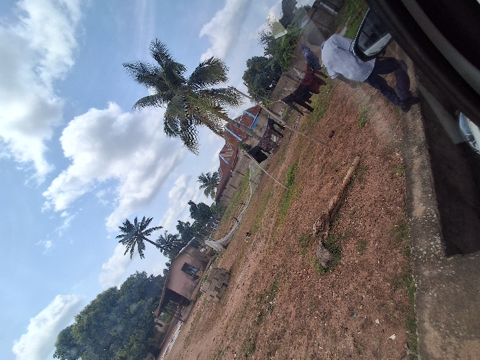 An outdoor scene in Takum, Nigeria, is captured under a partly cloudy blue sky from the perspective of a vehicle, with its window frame and internal reflections visible in the lower foreground. The ground is predominantly reddish-brown earth with sparse green vegetation. In the mid-ground, a male individual wearing a light-colored short-sleeved collared shirt and dark trousers walks away from the camera, heading towards the right. A tall palm tree stands prominently in the mid-right, while other trees and dense foliage are present in the background. To the far left, a light-colored, single-story building is visible, adjacent to a stack of gray concrete blocks. Another building with a reddish roof is partially discernible in the distant mid-ground. A clothesline, strung between two vertical poles, displays several pieces of dark laundry hanging to dry in the mid-ground. A weathered, fallen tree trunk lies horizontally on the ground in the mid-left. Two small, dark animals are visible near a distant fence line towards the left.