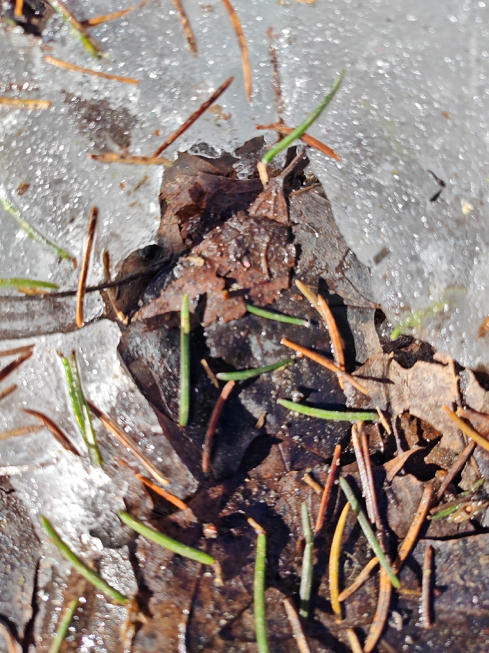 A close-up, high-angle view depicts a patch of ground cover in Lopukhinka, Russia, characterized by a transition from ice to organic debris. Irregularly shaped, partially melted ice, exhibiting a textured, glistening surface, occupies the upper and left sections of the frame. Embedded within and emerging from the ice are numerous coniferous needles, varying in color from vibrant green to shades of brown and orange. Beneath the ice, and predominantly visible in the lower and right portions, lies a layer of wet, dark brown, decaying broadleaf foliage. Scattered across these leaves are additional green and brown coniferous needles. No human or animal subjects are present; the scene is composed entirely of natural elements under apparent sunlight.