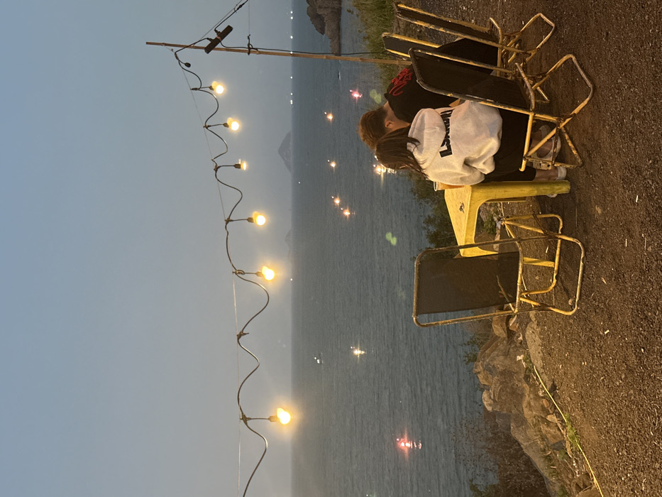 The image captures an evening scene at a coastal location in Vĩnh Lương, Vietnam. Two individuals are seated at a rectangular yellow plastic table on a dirt or gravel surface, facing a large body of water. The individual on the left, viewed from behind, wears a light grey hooded sweatshirt with dark lettering on the back. The individual on the right, also viewed from behind, wears a dark t-shirt with a red graphic design. A beverage glass with yellowish liquid is visible on the table. Four metal-framed folding chairs with dark fabric seats are arranged around the table, two of which are occupied. A string of approximately eight glowing yellow incandescent light bulbs is strung horizontally across the upper portion of the frame, supported on the right by a wooden pole. The background shows a dark blue-grey sky above the ocean, with several distant lights on the water, appearing as red and white/yellow reflections. Faint silhouettes of distant islands or landmasses are visible on the horizon. The immediate foreground on the left consists of rocky terrain sloping downwards towards the water.