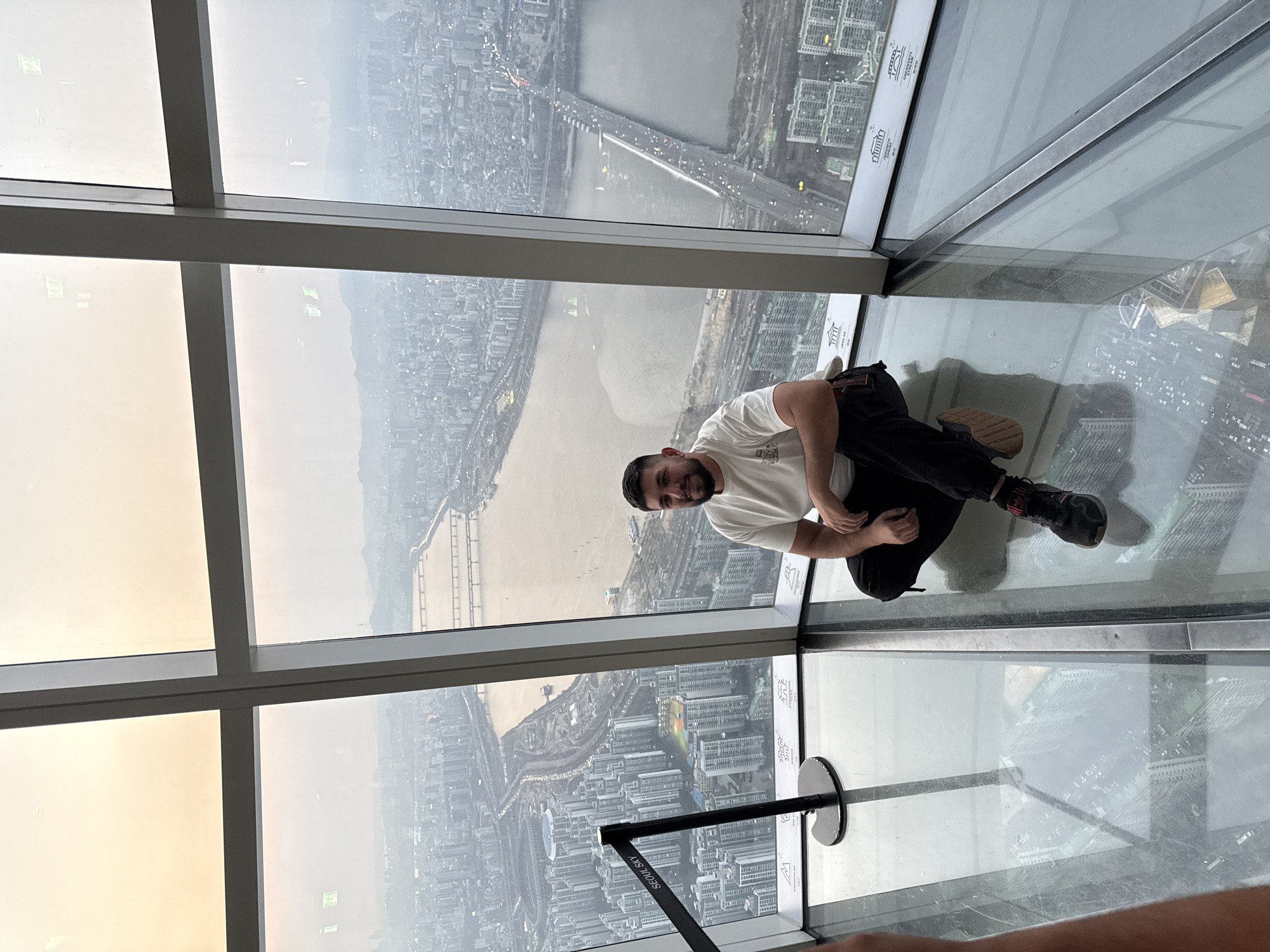 - "An adult male is seated cross-legged on a transparent glass floor at the Seoul Sky observation deck, located within the Lotte World Tower in Seoul, South Korea" by FM-LQAZF2, licensed under CC BY 4.0