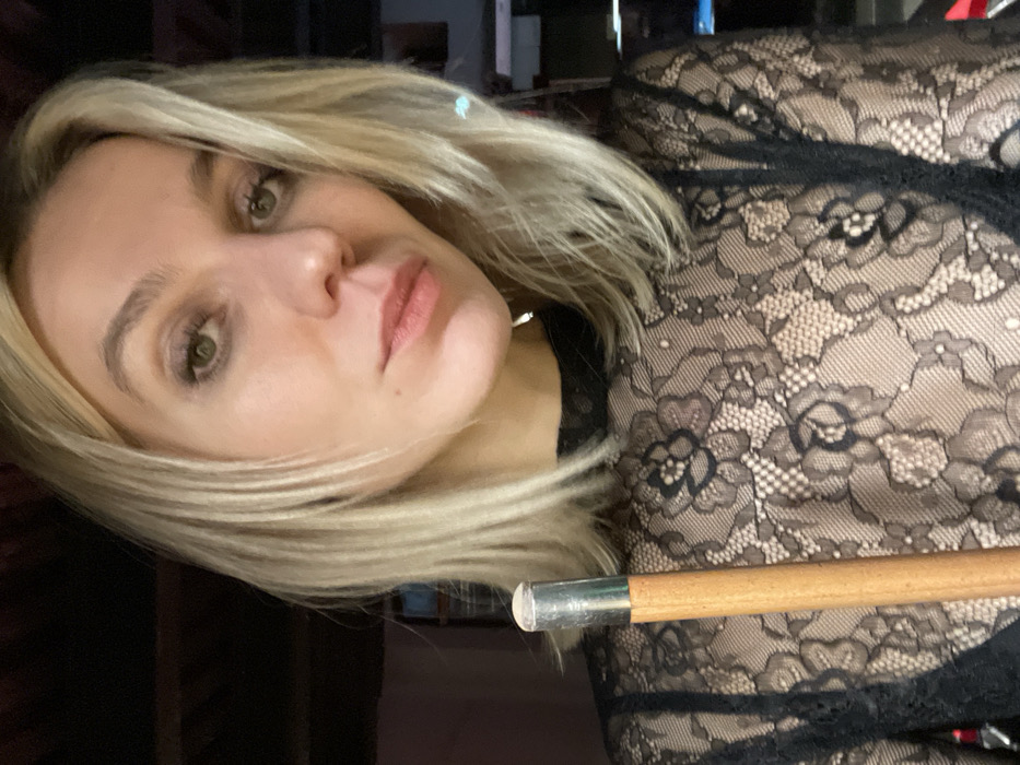 A blonde woman with green eyes and fair skin is seen in a close-up shot. She is wearing a black lace top. A brown and silver cue stick rests against her chest. The image is angled, with the woman's face tilted towards the camera. The background is dimly lit, suggesting an indoor setting. The focus is sharp on her face and the cue stick.