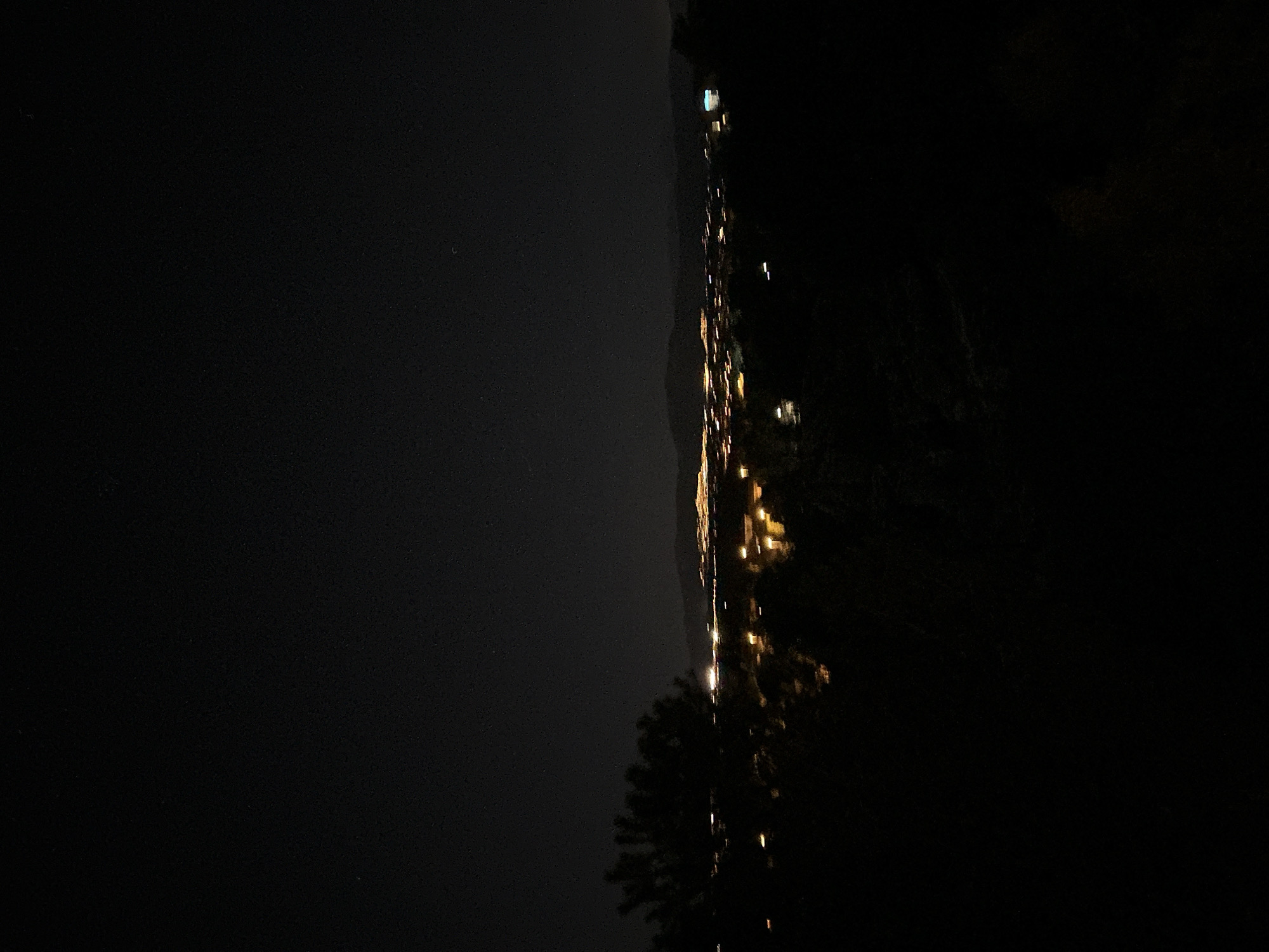 A night view of Torrelodones, Spain, shows city lights stretching along the base of a dark hill. The left side of the image is a dark sky. The scene is quiet and dimly lit.