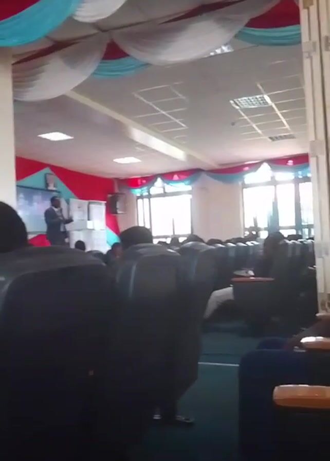 lecture hall filled with rows of black, cushioned chairs occupied by people. A man stands in front of the room, likely giving a presentation. The hall is decorated with red, white, and light blue draping fabric across the ceiling. There are windows on the right side of the room. A few people are standing by the entrance. The floor is covered with a blue carpet. The lighting appears to be standard fluorescent.