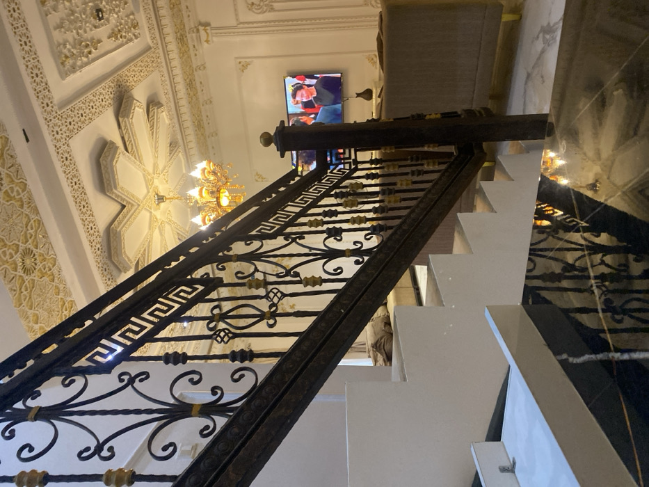 This image depicts the interior of a luxurious residence located in Galadimawa, Nigeria. The foreground features a modern, open-tread staircase with white risers and what appears to be a dark, reflective, possibly black marble tread at the bottom. The staircase is flanked by an ornate wrought iron balustrade with dark bronze or black metal, featuring classical Greek key patterns, scrolling motifs, and gold-colored accents on the balusters. Above, an elaborate ceiling is visible, characterized by intricate white and gold plasterwork, including a large central medallion with an octagonal star pattern, from which a multi-tiered gold-colored crystal chandelier hangs, illuminated. Additional decorative plaster molding with gold detailing adorns the ceiling edges and upper walls. In the background, visible beyond the staircase and balustrade, a wall-mounted flat-screen television displays two individuals; one male in a suit and one female in a dark, possibly black, dress. Below the television, part of a light brown or tan upholstered sofa or sectional is visible, positioned on what appears to be light-colored marble or tiled flooring. Another piece of upholstered furniture, possibly a chaise lounge or a segment of a sofa, in a similar light brown color, is partially visible near the base of the staircase on the left. The overall environment suggests a well-lit, affluent interior space. No human figures are present or interacting within the immediate scene, only those depicted on the television screen.