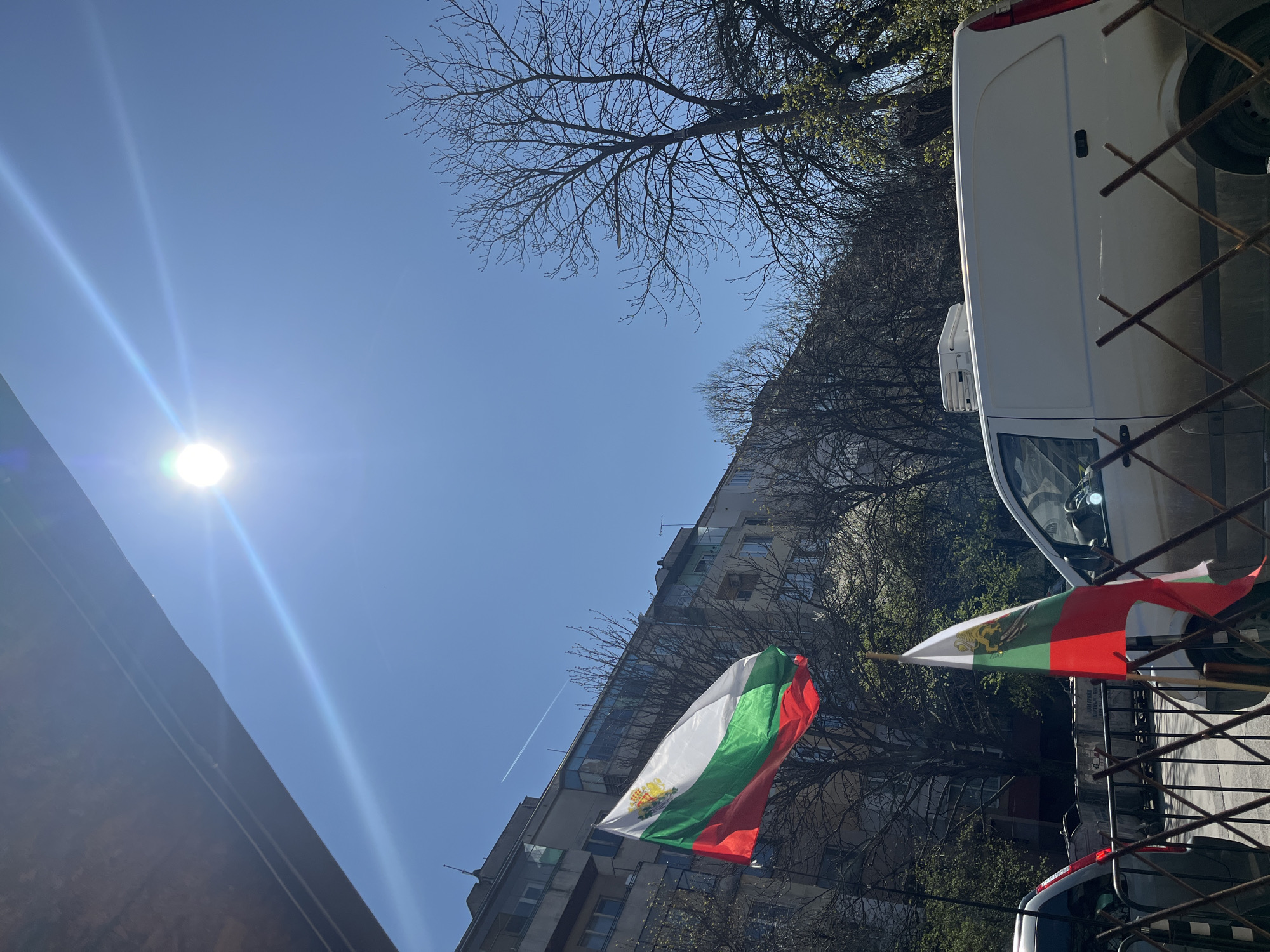 bright sunny day in Sofia, Bulgaria, with the sun shining in a clear blue sky. A white van is parked along a street with buildings visible in the background. Two Bulgarian flags are attached to the van or a nearby structure. Bare tree branches are visible against the sky and behind the buildings.