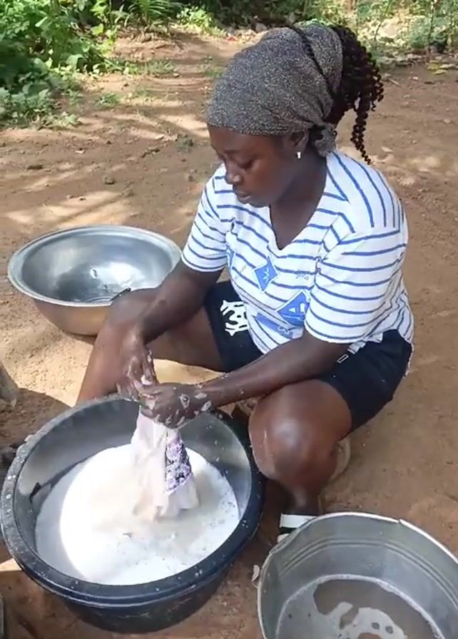 A woman wearing a striped t-shirt, dark shorts, and a headscarf is crouched outside, washing clothes. She is sitting between a black tub filled with soapy water and a silver bucket with water. To her left is another silver bowl. The woman is focused on scrubbing a piece of fabric in the soapy water. The ground is dirt, and there is vegetation in the background.