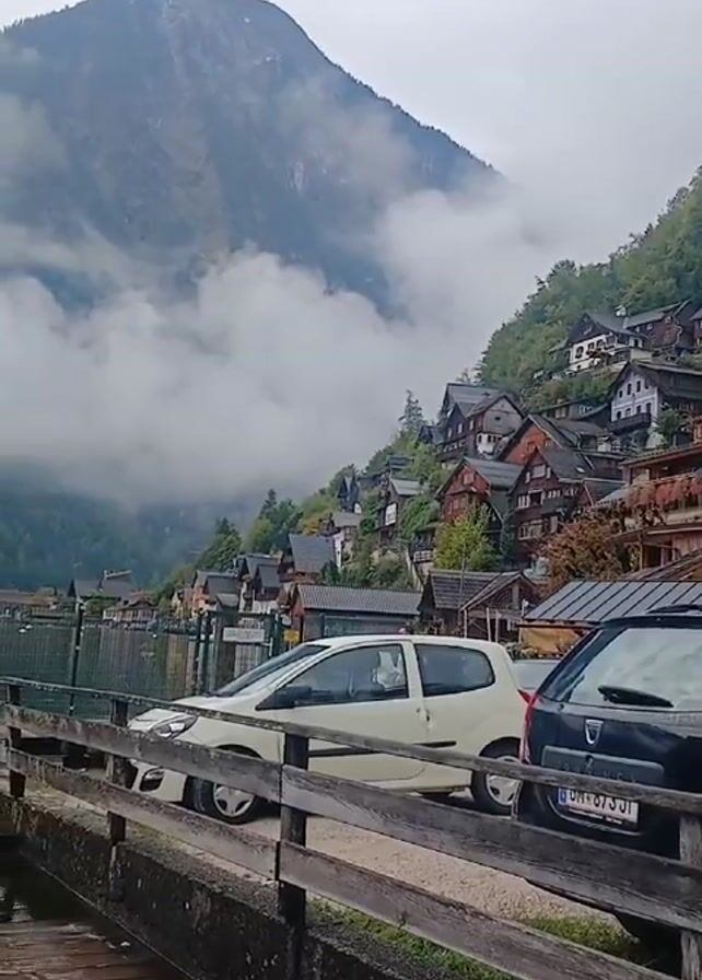 scenic view of Hallstatt, Austria. The camera pans left from a wooden pier where two cars are parked to show a lake with a small town on its bank. Behind the town, a large mountain is partially obscured by clouds. The sky is overcast. The water in the lake is calm. The town is built on a hillside, and the houses are clustered close together.