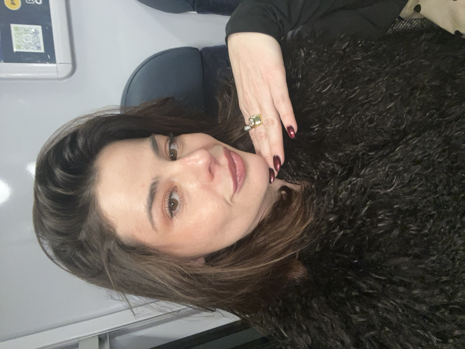 A woman is sitting down and smiling while she poses for a photo. She has shoulder-length brown hair and light skin. She's wearing a black outfit and what looks like a black coat. She has on a large gold ring with a green stone. Her nails are dark. A blue chair and a white wall are behind her.