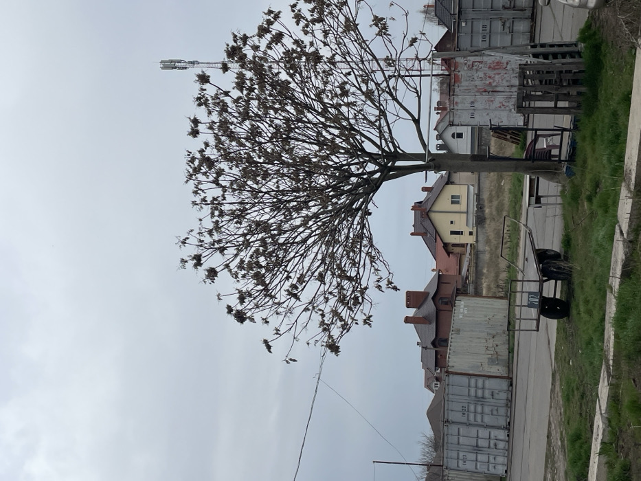 tree with bare branches in the foreground, with a large shipping container and a pallet behind it. In the background, several residential homes can be seen with grey roofs and red brick walls. The houses are located on a street, and there is a power line running across the sky. The image was taken in the town of Lymanka in Ukraine, at a location with latitude 46.383 and longitude 30.704. The image is a daytime scene, and the sky is cloudy. The tree is located between the street and the shipping container, and appears to be in a yard area.