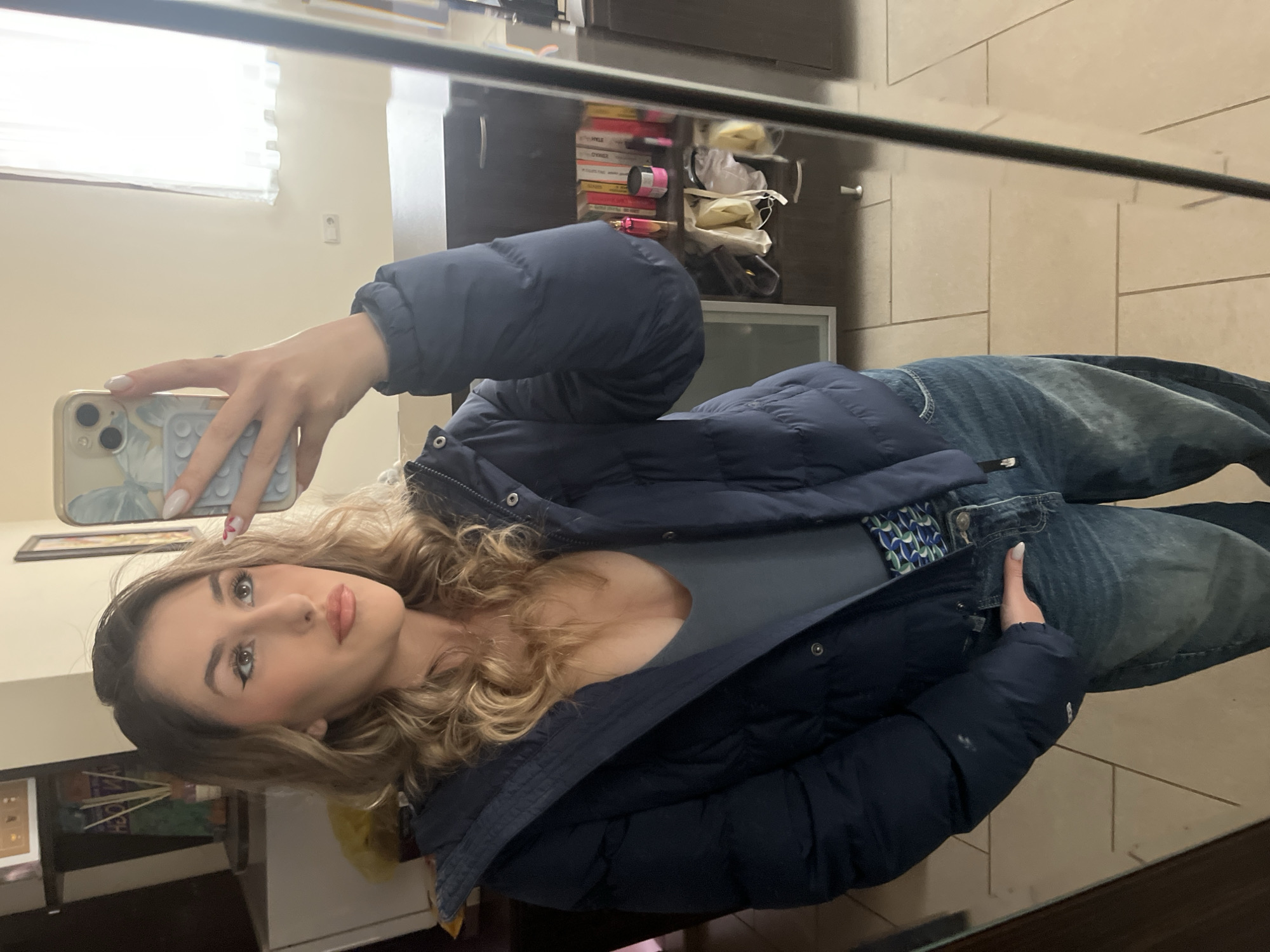 A young woman is taking a selfie in front of a mirror. She is wearing a blue puffy jacket, a gray top, and blue jeans. She is holding a phone in her left hand. The background includes a window with white blinds, a dark-colored cabinet with items on top, and a tiled floor. It is not possible to determine the exact location in Sofia, Bulgaria.