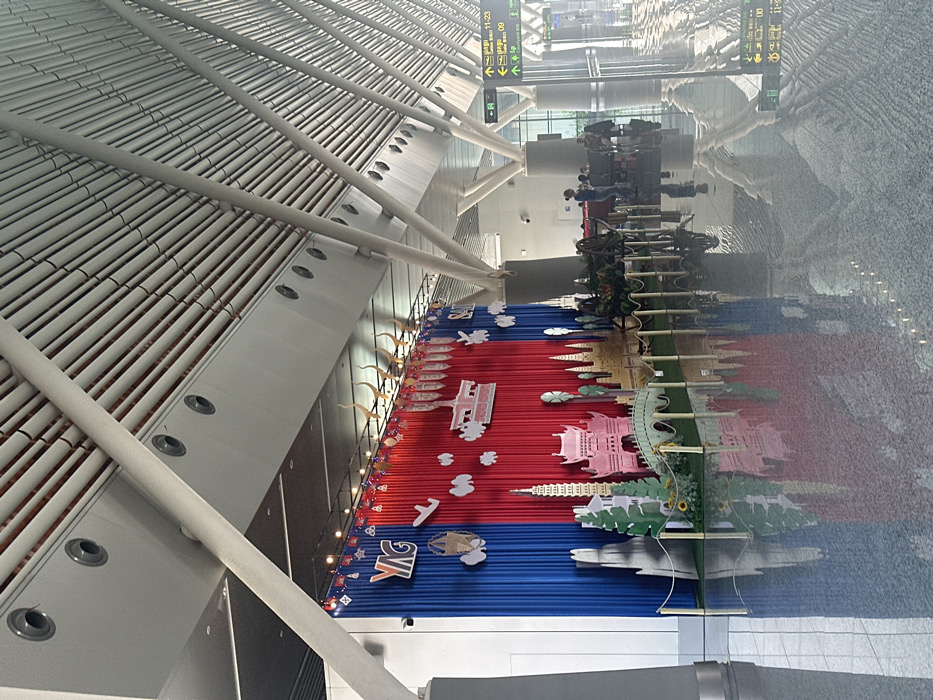 An indoor shot displays a high-ceilinged airport terminal. Dominating the scene is a large, colorful banner or display, featuring red and blue sections adorned with decorative cutouts of buildings, clouds, and other elements. Overhead, the ceiling is composed of a series of parallel beams, creating a pattern that directs the eye into the distance. Signs indicate directions, while figures of people can be spotted in the background.