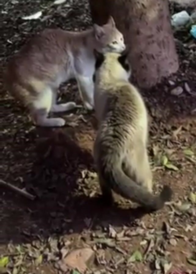 Two cats, one orange and one Siamese, are facing each other by the base of a tree. The orange cat is crouched slightly, while the Siamese cat stands its ground. The ground around them is covered in leaves and debris, including some green plastic pieces. The background is dark, with a hint of light indicating it might be nighttime. The video is steady and focuses primarily on the two cats.