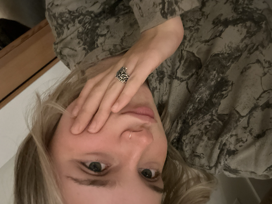 A young Caucasian female is depicted in a close-up, angled portrait taken indoors in Squamish, Canada. She has blonde hair, green eyes, and fair skin, with a small silver hoop piercing visible in her left nostril. Her head is tilted slightly to the right, and she is looking directly at the viewer. Her left hand is raised to her face, with the palm resting against her left cheek and fingers spread. A silver-toned ring with an intricate, dark design is worn on the ring finger of her left hand. She is wearing a long-sleeved top featuring a mottled, abstract pattern in shades of grey and dark grey. The background is blurred, showing muted, warm tones and a vertical dark wooden element in the upper right. The lighting is soft and consistent with an indoor setting.