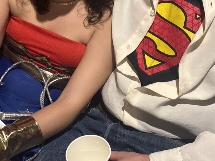 The image displays a close-up view of two individuals situated in what appears to be an indoor setting within Naucalpan de Juárez, Mexico. The person on the left is adorned in a costume, featuring a red, strapless, glitter-flecked top with a gold-colored trim, consistent with a Wonder Woman portrayal. Below the red top, a blue garment is visible. A silver-colored, braided rope is draped across the individual's midsection and right arm. A shiny, golden forearm gauntlet is worn on the right forearm. The person on the right wears a light-colored, long-sleeved button-down shirt, which is unbuttoned to reveal a dark tie with a prominent red and yellow "S" emblem, indicative of Superman. This individual's lower body is clad in blue denim jeans. A white, disposable cup, containing a light-colored liquid, is held by the right hand of the person in the Superman attire, positioned in the lower-central part of the frame. The individuals are in close proximity, suggesting they are seated or standing next to each other.