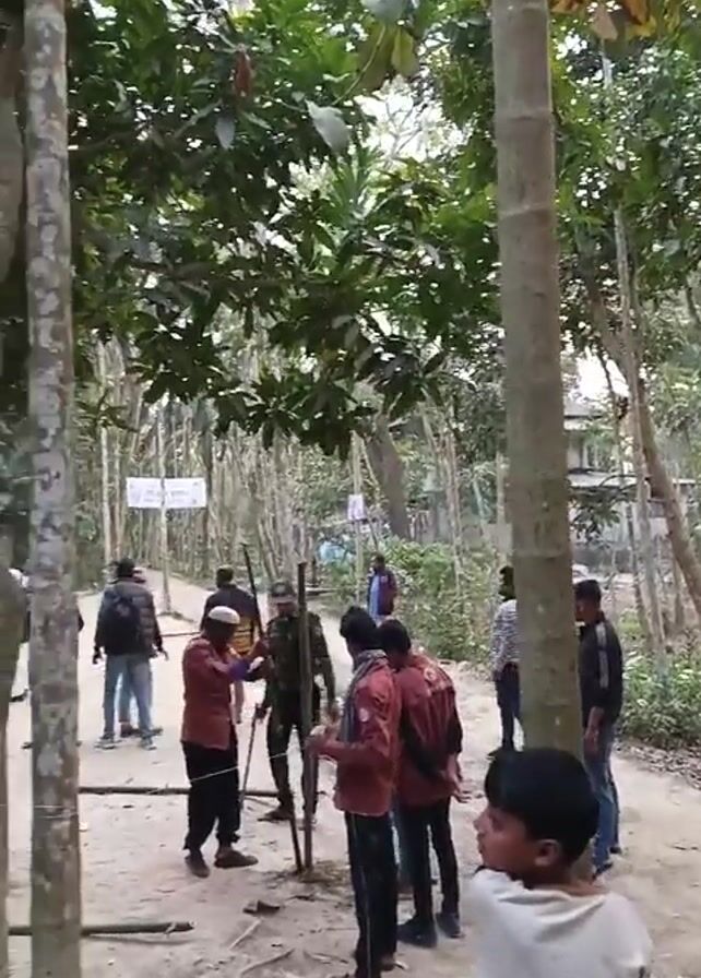 group of people gathered outdoors on a dirt path surrounded by trees. A group of individuals, some wearing matching red tops, are seen working on some equipment near a pole. Several other people are standing around watching. A young boy in a white shirt is in the foreground in the initial shot. The camera then shifts to show a young boy in a yellow shirt running along the path, interacting briefly with an adult wearing a black jacket. The path leads towards a building with a red and white facade. Other people are seen walking along the path in the distance. The environment appears to be a rural or semi-rural setting.