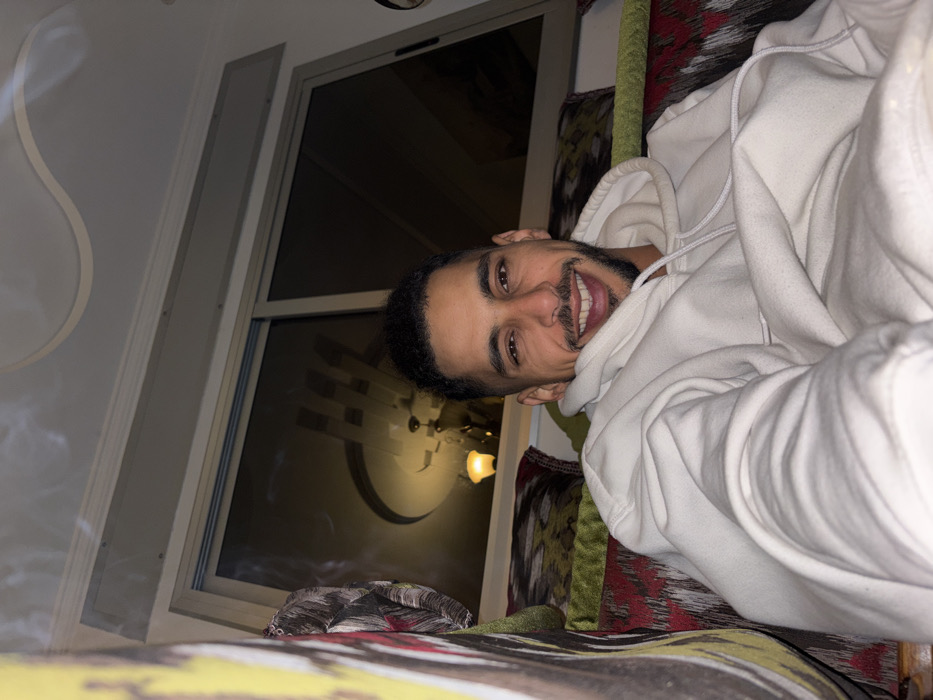 A smiling man in a white hoodie lies on a patterned couch. He faces the camera, with a window to his left. The window reflects an interior view, including a light fixture. He has dark hair, a beard, and visible teeth. The couch displays red, green, and brown patterns. The background includes a wall with a white panel.