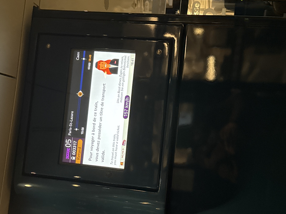 train information display. The train is number 05, and it's delayed ("Retard"). It's traveling from Paris-St-Lazare, scheduled to depart at 15:58, and heading towards Caen, with an arrival time of 18:48. The train's current speed is 157 km/h. The display advises passengers in French, English, and German that they must have a valid ticket to travel on the train. A cartoon of a train conductor is displayed.