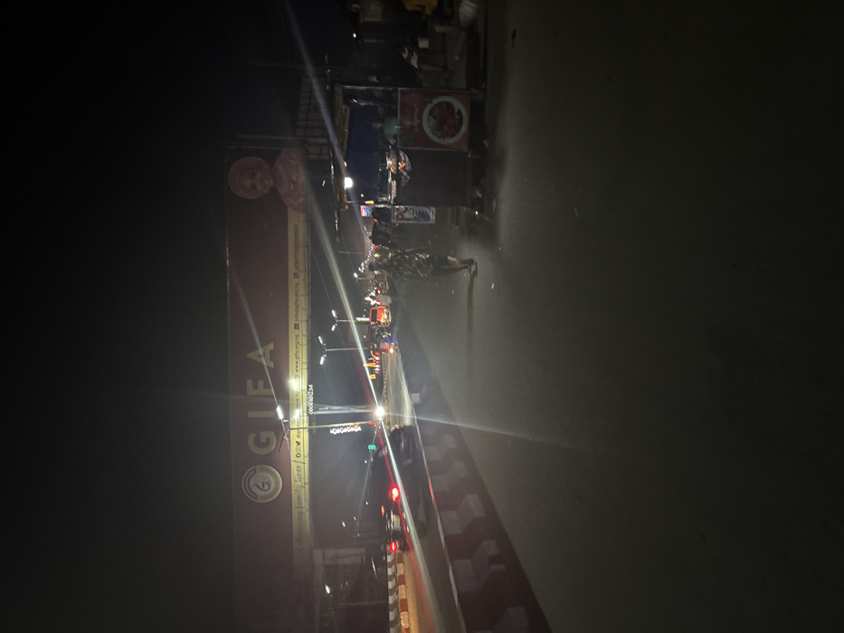 At night, a street scene unfolds under bright streetlights. On the left, a large vertical sign displays "G.I.F.E.A." in bold letters, along with smaller text and logos. Street vendors set up small stalls along the roadside. Vehicle lights blur into streaks as cars pass. A person walks on the street. The scene has a moody, urban atmosphere.