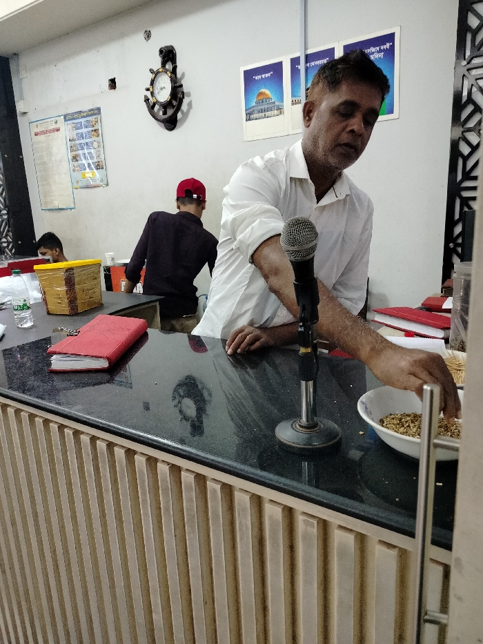 The scene takes place in a building in Barishal, Bangladesh, at the coordinates 22.728 latitude and 90.337 longitude. There are three men in the room. One is wearing a red cap and is standing behind a counter, facing the camera. Another is wearing a white shirt and is standing to the right of the counter, reaching into a bowl of brown particles on the counter. The third man is wearing a blue shirt and is seated near the counter, his face turned away from the camera. There is a microphone standing on the counter and a red notebook is lying on the counter. The counter is made of dark brown laminate and has a vertical wooden panel behind it. There is a window in the background, through which some items and a person can be seen. The wall behind the counter is white and there are three posters on the wall. There is a clock on the wall, above the man in the red hat. The room appears to be a business setting, possibly a shop or a restaurant. The man in the white shirt appears to be speaking or singing. The man in the blue shirt is in a more informal setting, likely a customer. The man in the red hat appears to be working in the shop. The man in the white shirt is either speaking into the microphone or looking at the bowl of brown particles.