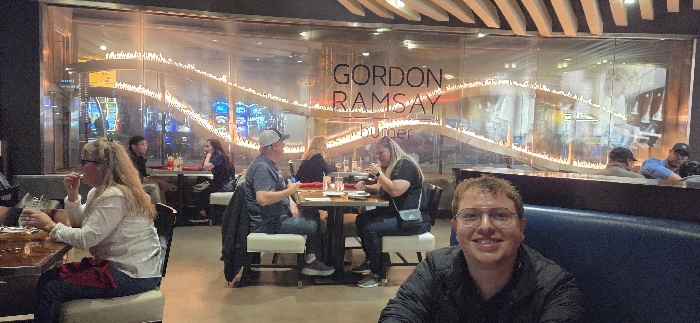 - "A person wearing glasses smiles from a booth at Gordon Ramsay Burger" by FM-lhDZW2, licensed under CC BY 4.0
