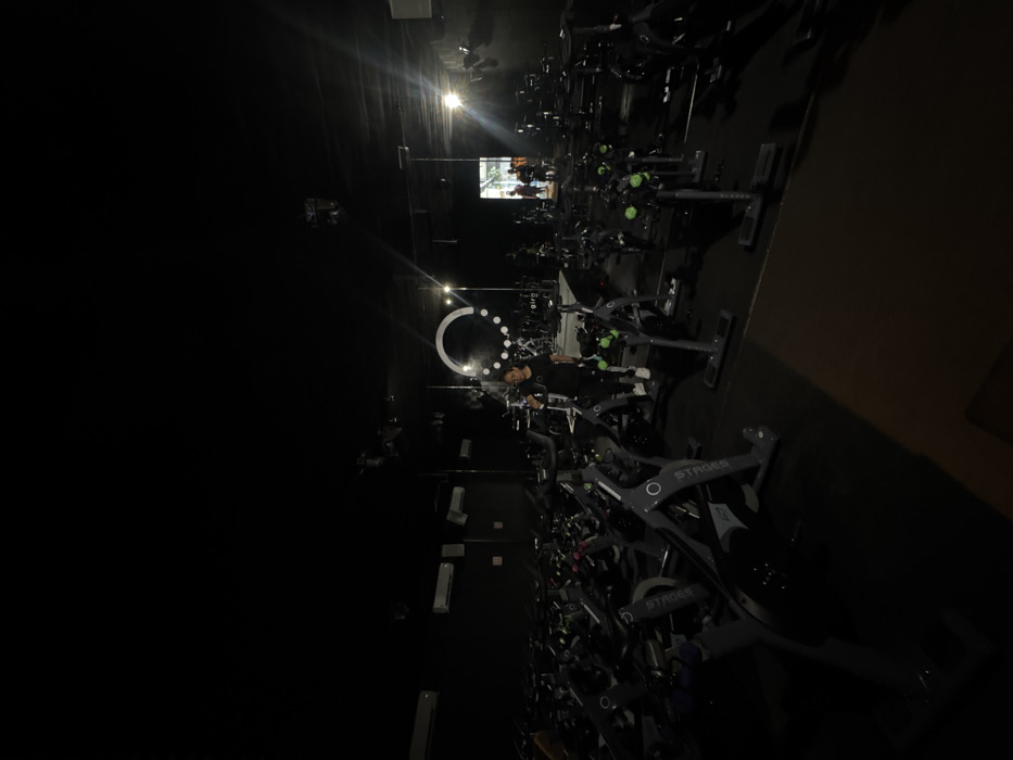 In a dimly lit exercise studio, rows of stationary bikes dominate the scene
