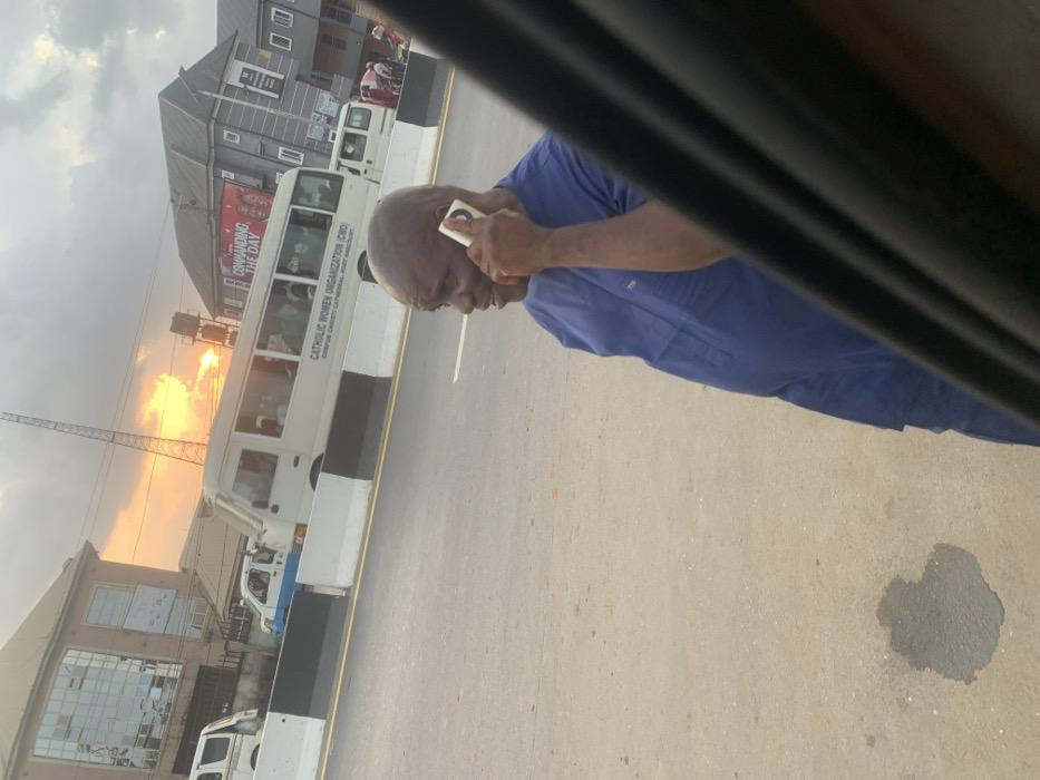 A man in a blue shirt speaks on a cell phone. A white van with the words "Catholic Women Organization" is parked nearby. The street is paved and has a black and white barrier. A small water spot stains the concrete. Buildings are in the background under a cloudy sky, and the setting sun illuminates the scene. Dark blurry lines cross the upper-right of the frame.