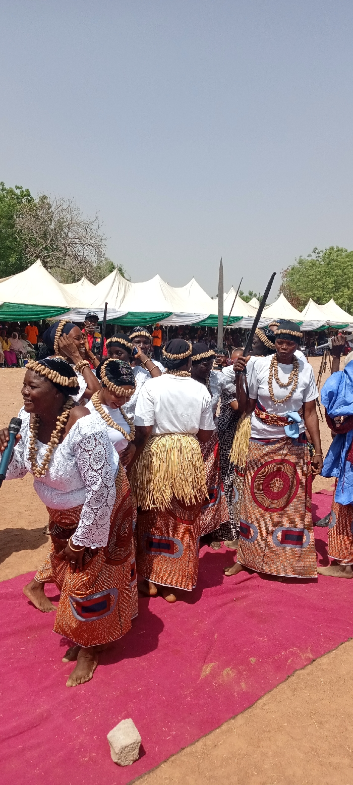 An outdoor scene in Jimeta, Nigeria, depicts a group of approximately 10-15 individuals, primarily women, performing or participating in a cultural event under bright daylight