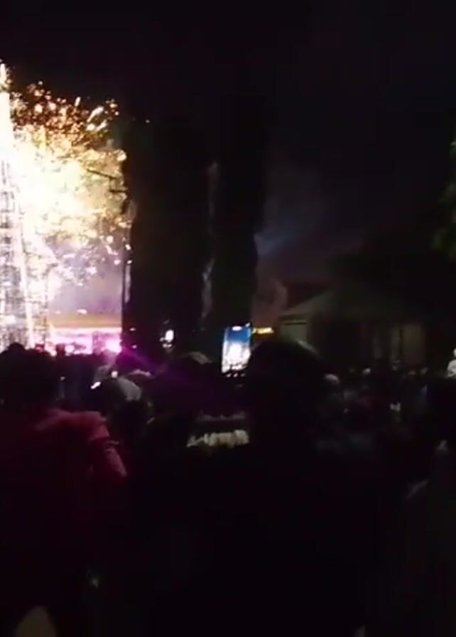 crowd of people gathered at night to watch a fireworks display and the lighting of a Christmas tree