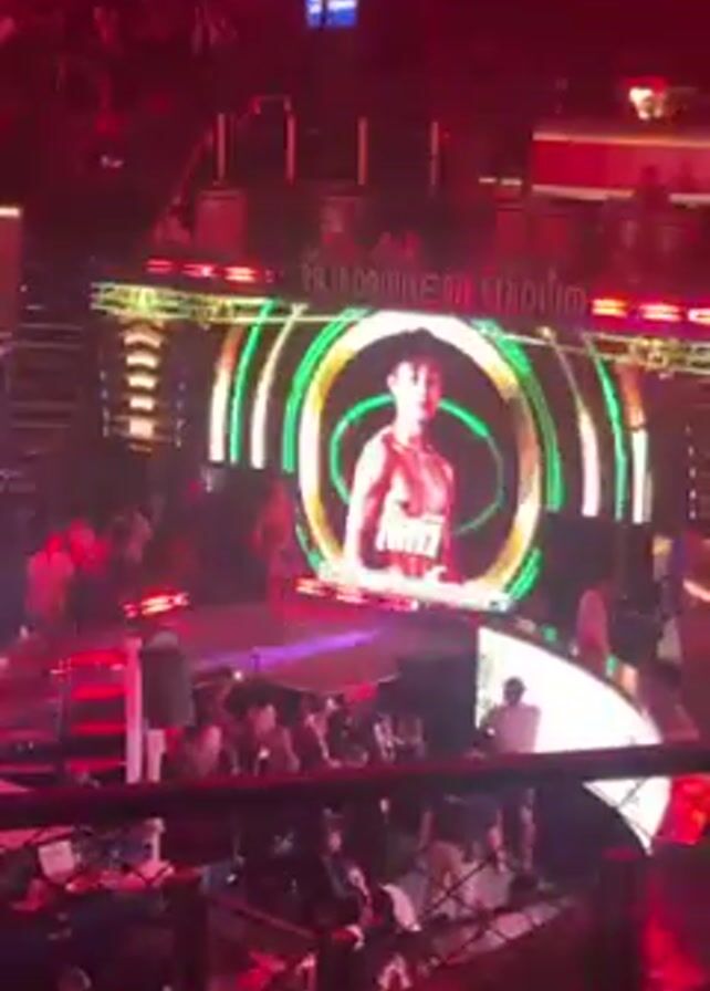 boxing ring in a large stadium, with many spectators in the stands. A large screen displays a boxer's image, accompanied by the text "RAJADAMNERN STADIUM." A boxer wearing red attire is walking into the ring, while other individuals, potentially trainers or staff, are present. There is bright lighting, including red lights above the ring and a general spotlight. The atmosphere appears to be energetic, possibly preceding a match.