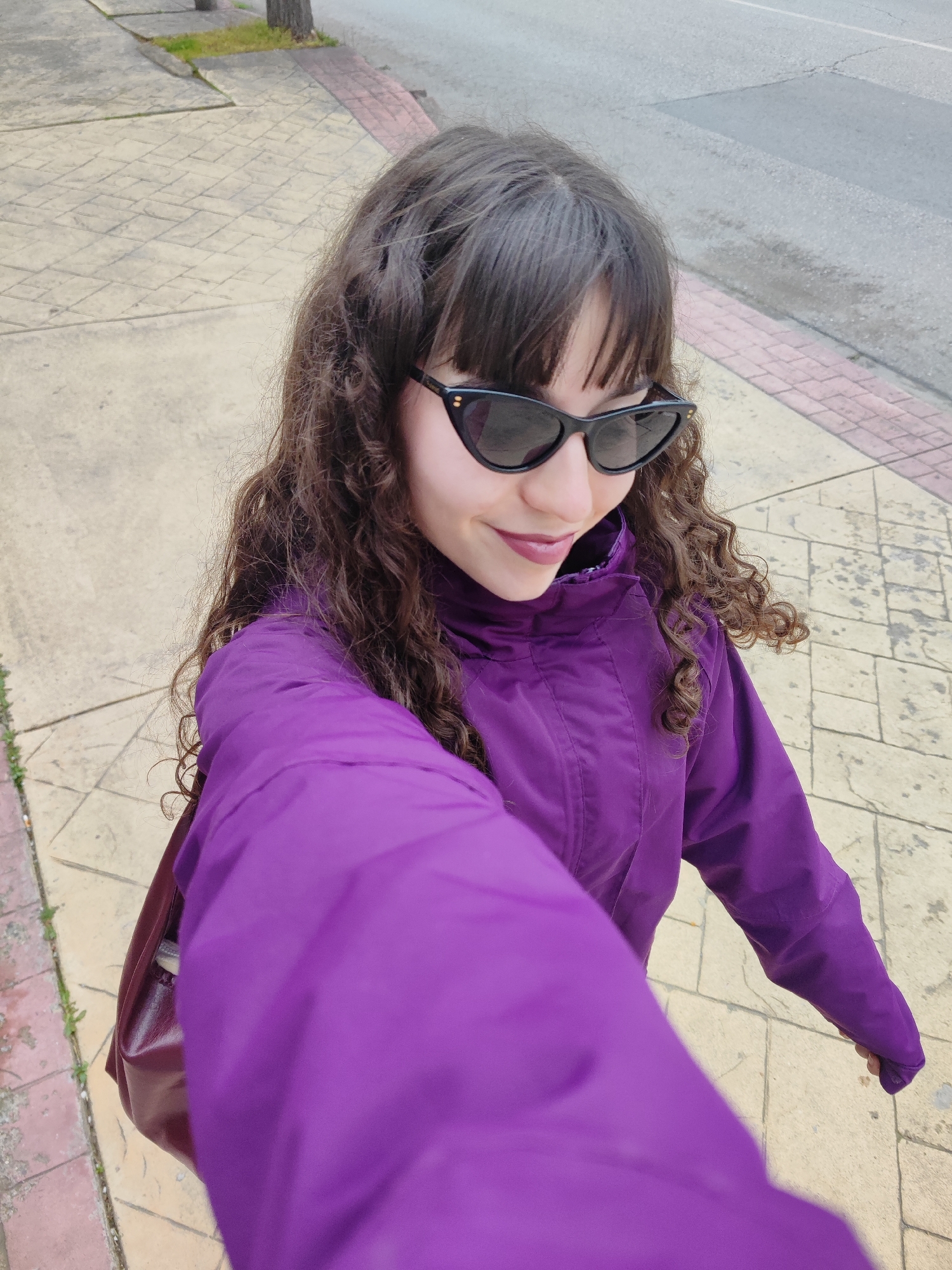 A woman is taking a selfie while standing on a sidewalk in an urban area. She has long, curly, dark brown hair with bangs and is wearing black cat-eye sunglasses and a purple jacket. She is also carrying a dark-colored bag slung over her shoulder. The sidewalk is paved with rectangular tiles and bordered by a street with a curb. The presence of what appears to be Bulgarian paving pattern indicates that this image could be in a city like Sliven, Bulgaria. The sky appears overcast.