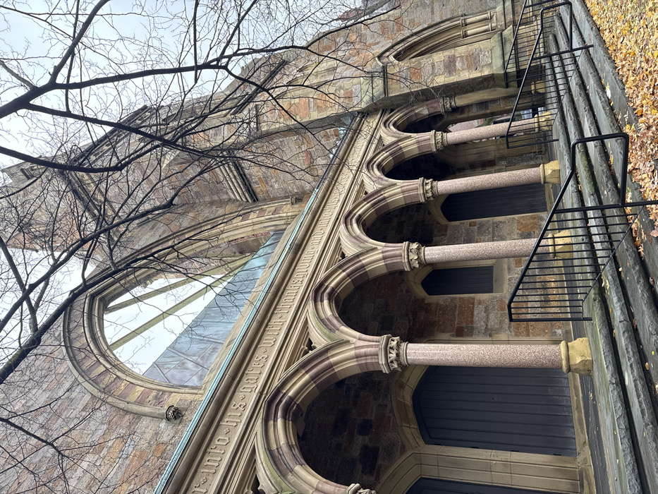 - "A low-angle shot reveals the facade of a Gothic-style building with arched windows and columns, partially obscured by bare tree branches" by FM-ownra2, licensed under CC BY 4.0
