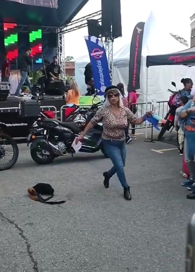 The video depicts a street scene with a woman dancing in front of a stage. The woman is wearing jeans, a patterned shirt, a hat, and boots. She is dancing with her arms outstretched. There is a band performing on stage behind her, with lights and banners visible. Several motorcycles are parked near the woman, and other people are standing around watching. The ground appears to be asphalt.