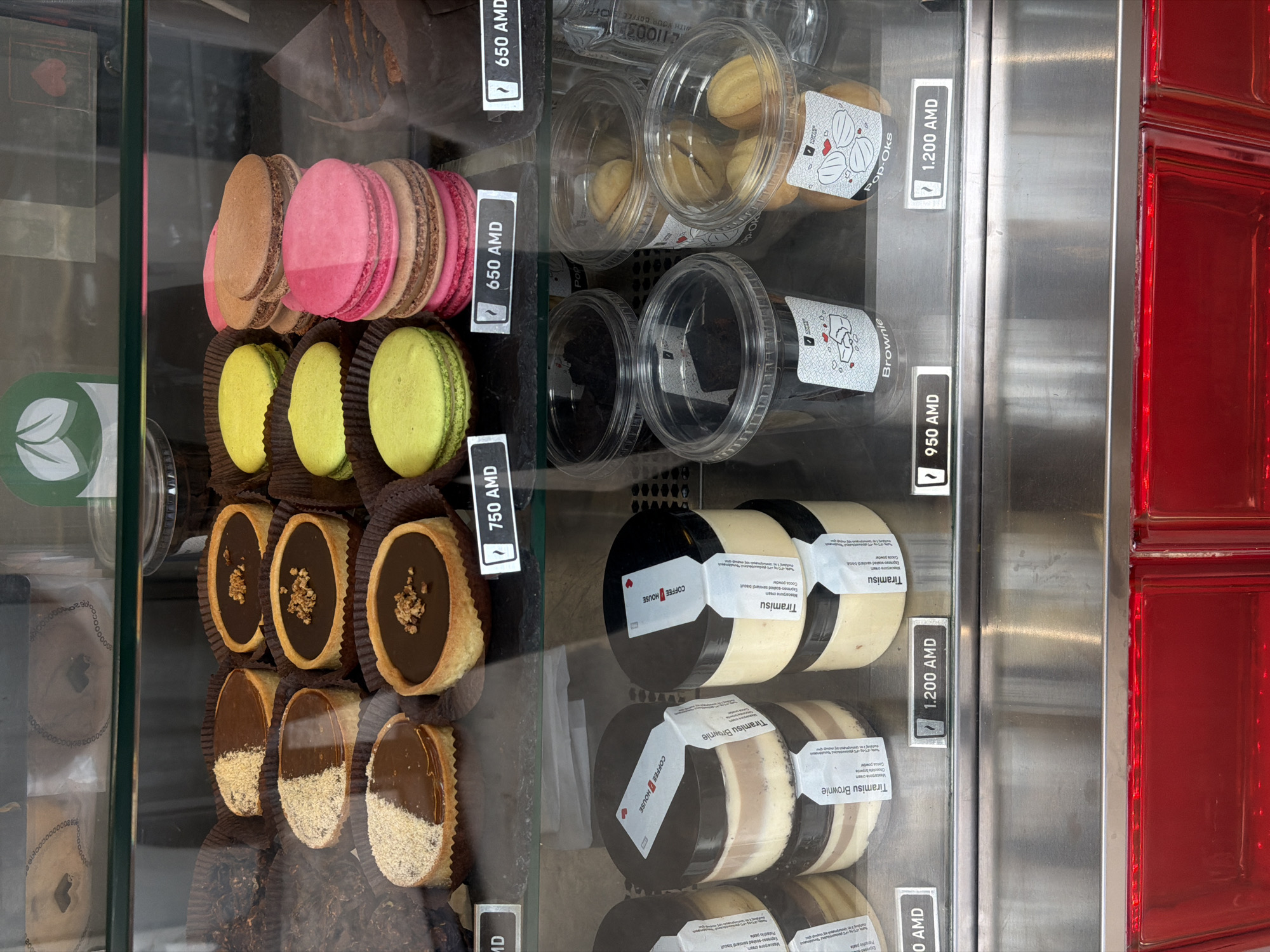 A display case contains various desserts for sale. The items visible are macarons in pink, brown, and green, along with chocolate tarts. Also displayed are brownie and cookie containers. Labels next to each item display their prices in AMD. The location is Yerevan, Armenia, based on the AMD currency. The case is made of glass and stainless steel, with a red brick-like structure visible on the far right.