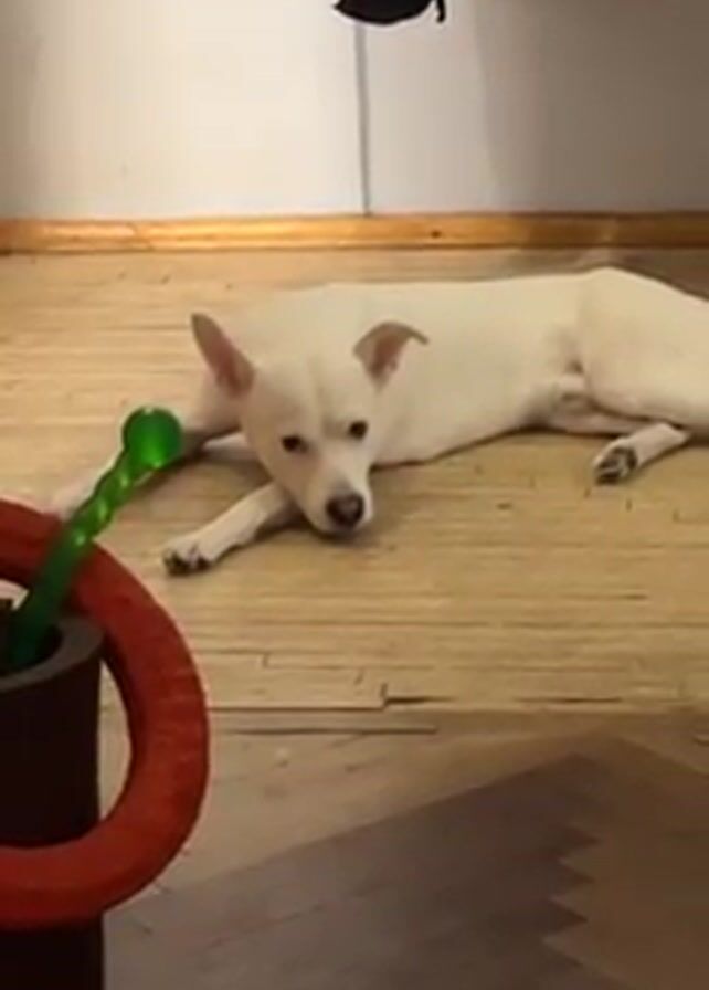 A white dog lies on a wooden floor near a cylindrical object with a red ring and a green serpentine shape extending from it. The dog is looking at the camera. The floor is light brown and there is a white wall behind the dog with some dark clothing hanging on it.