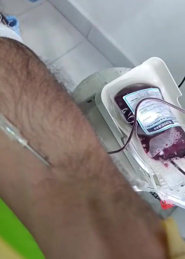 person donating blood. Their arm is extended, and a needle is inserted into a vein. A tube leads from the needle to a plastic bag filled with blood. The arm is secured with a white bandage. The person is seated on a green chair. The floor is white tile. The person is wearing brown pants and grey shoes. Another container containing blood is visible in the background.