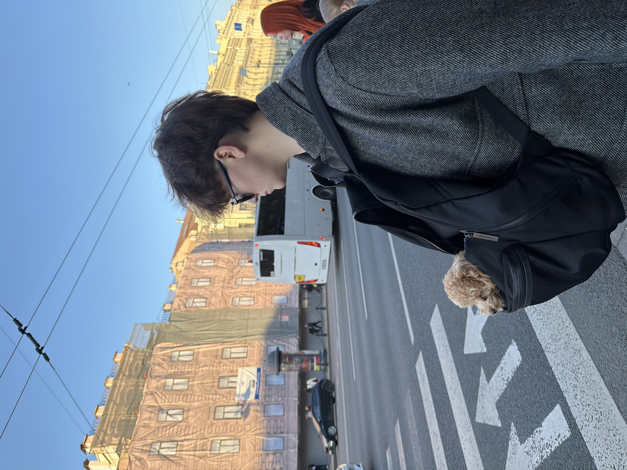 - "A woman with short brown hair and sunglasses is carrying a small poodle in a black bag, crossing a street in Saint Petersburg, Russia" by FM-ZXvTu1, licensed under CC BY 4.0