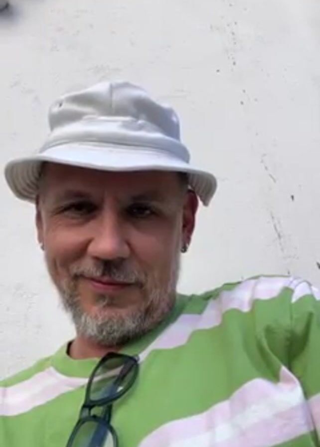 A close-up shot shows a man wearing a white bucket hat and a green and pink striped shirt. His glasses hang from the shirt's neck. He has a light beard with gray hairs and is looking at the camera with a slight smile. He has an earring in one ear. The background is a white wall with what appear to be decorative elements.