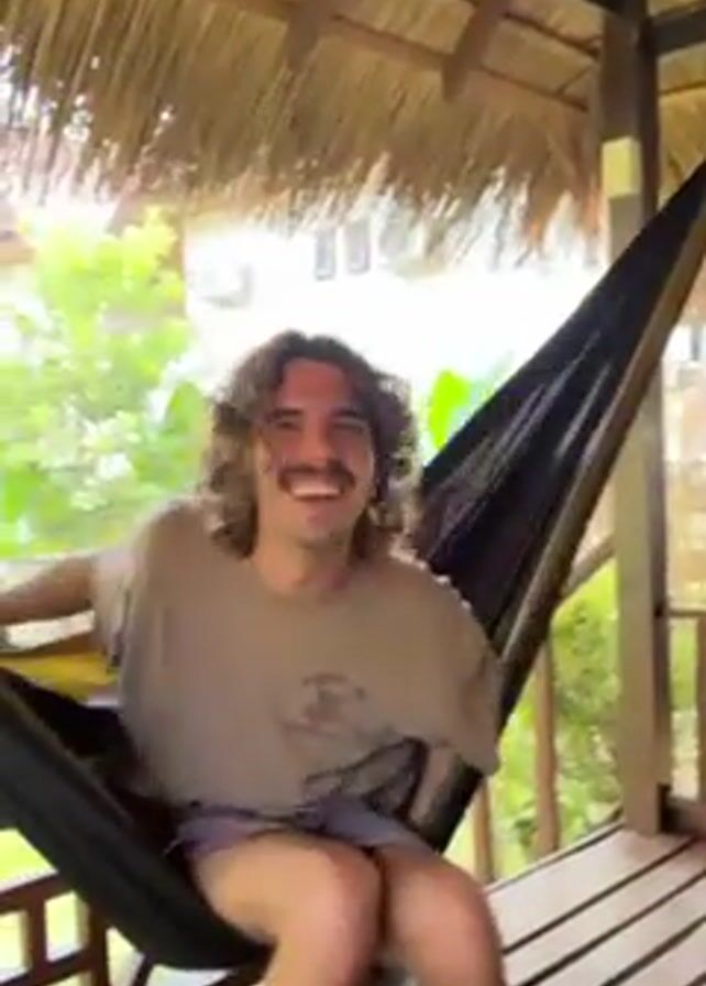 A young man with curly brown hair and a mustache is sitting in a black hammock under a thatched roof. He’s wearing a tan t-shirt and grey shorts. He laughs and wiggles his legs as he settles into the hammock. Outside the porch area, there are green plants and a white building visible. The porch has a wooden floor.