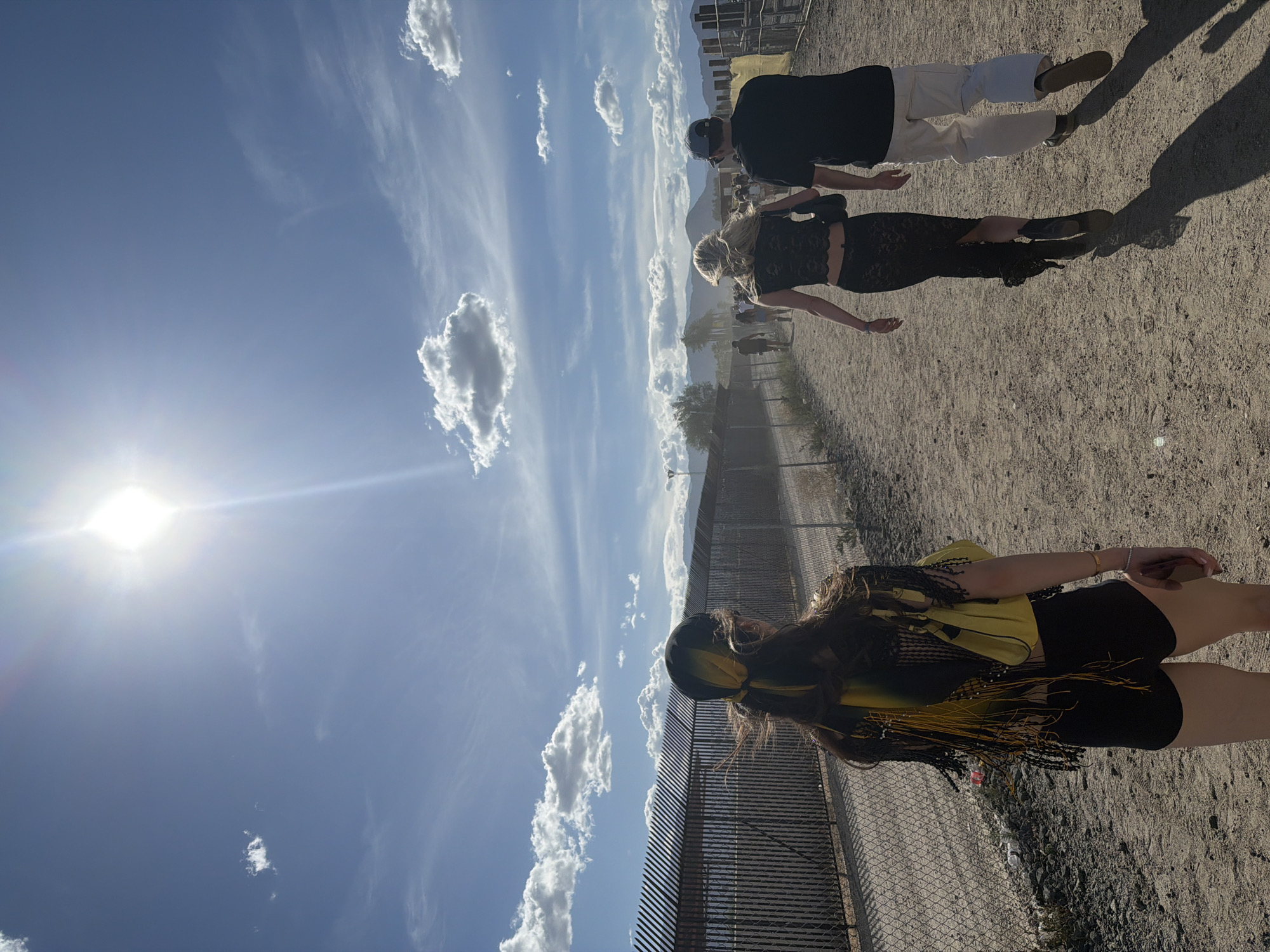 sunny outdoor scene with three individuals walking on a dirt path. A fence runs along the left side of the path. The sky is blue with scattered clouds and the sun is visible. The person closest to the camera is wearing black shorts and a yellow and black top with fringe. Another person wears a black top and a black dress. A third person is wearing a black top and cream-colored pants. The ground appears to be dirt or sand. While it is difficult to precisely pinpoint the exact location, based on available information and the visual characteristics of the scene (dirt path, fence, open area), it is plausible that the image was taken in a less developed area of Indio, California.