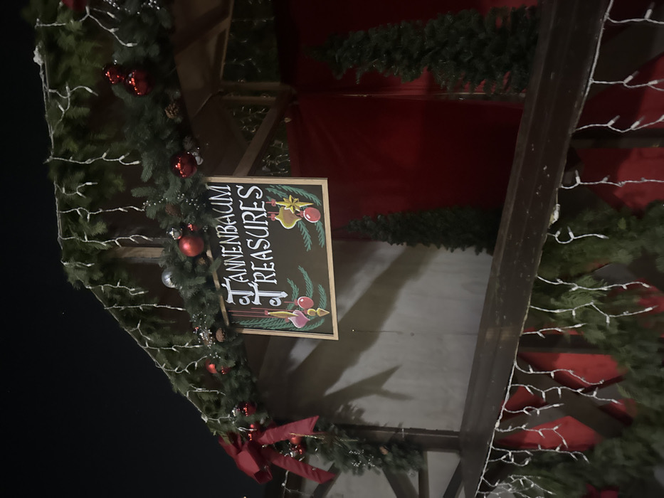 An outdoor market stall, operating at night in Los Angeles, United States, is depicted. The stall's wooden framework is extensively decorated with artificial evergreen garlands, red and silver spherical ornaments, and pine cones. White icicle string lights hang from the roofline and a lower counter railing, which is also adorned with greenery. A rectangular, dark-colored sign with a light frame hangs prominently, displaying "TANNENBAUM TREASURES" in white script, flanked by painted Christmas ornaments. Behind the sign and within the stall, a red fabric backdrop is visible. Two slender artificial evergreen trees stand upright against this red backdrop. No individuals are present.