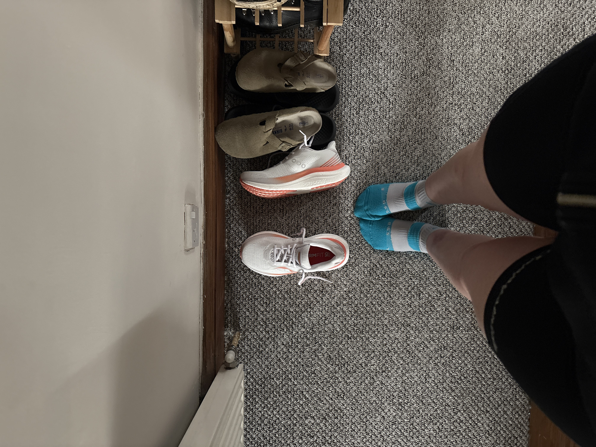 The scene is an indoor domestic setting, located in the city of Manchester, United Kingdom. An overhead perspective captures the lower legs and feet of an individual, wearing turquoise and white striped athletic socks and black shorts, standing on a grey speckled carpet. Against a light-colored wall and dark wooden baseboard in the upper portion of the image, multiple pairs of shoes are arranged. A pair of white Saucony running shoes with orange/coral accents is on the left, one oriented with its toe towards the wall, the other with its heel towards the wall. To their right, a pair of light brown suede Birkenstock clogs, marked size 38, rests atop black sandals. A wooden shoe rack, partially visible on the far right, holds additional dark footwear. On the far left, a white object, consistent with a radiator or door frame, is visible near the wall, with associated piping. An off-white BS 1363 standard electrical outlet is mounted on the wall above the baseboard on the right. A horizontal shadow is cast across the upper wall, indicating a light source.