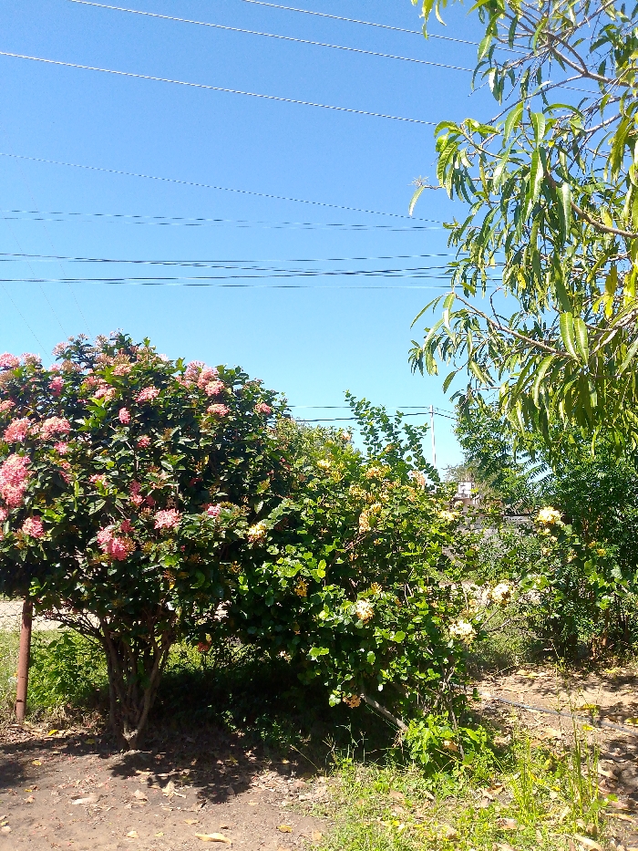 A daytime shot displays a landscape featuring an array of vibrant flora against a clear blue sky crisscrossed with power lines. A prominent bush, laden with pink flowers, stands to the left. To the right, greenery extends into the scene, with light yellow flowers appearing amidst the foliage. A dirt ground covers the foreground, merging into scattered patches of grass and weeds. The presence of a tall tree on the right adds height to the composition.