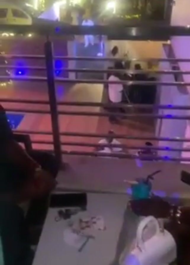 nighttime scene at an outdoor event. People are milling around on a lower level, which appears to have a wooden floor and blue ambient lighting. They are wearing various outfits, including white shirts and dark attire. There is a white van parked in the background. In the foreground, there is a table with several objects on it, including a white purse, a wallet, and what appears to be a pack of cigarettes. Two people are seated at the table, partially visible in the frame. A metal railing separates the foreground and background, offering a partial view of the activity below.