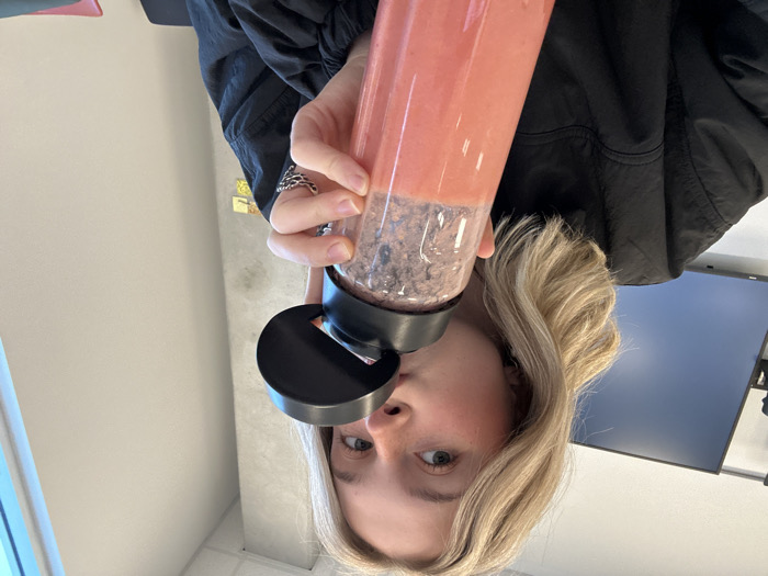 A young woman with blonde hair holds a clear plastic bottle containing two distinct layers: a brown mixture at the bottom and a pink liquid above. The bottle has a black lid with a spout. The woman wears a black jacket and a silver ring. In the background, a computer monitor is visible against a light-colored wall. The photo is taken from a slightly low angle and rotated.