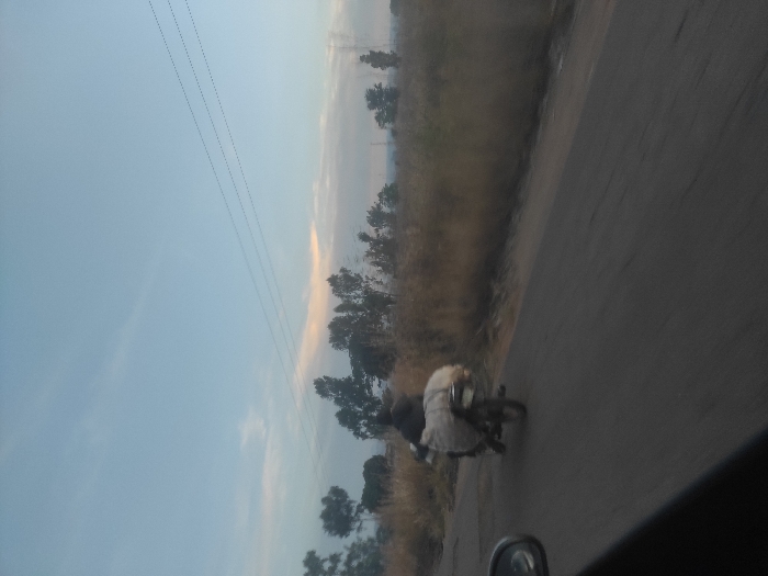 A slightly blurred image shows a person riding a bicycle on a paved road. The rider is wearing light-colored clothing. Fields and trees line the side of the road, giving a rural impression. Overhead, power lines stretch across a partly cloudy sky. The photograph is taken from inside a vehicle with a portion of the car's interior visible at the bottom.