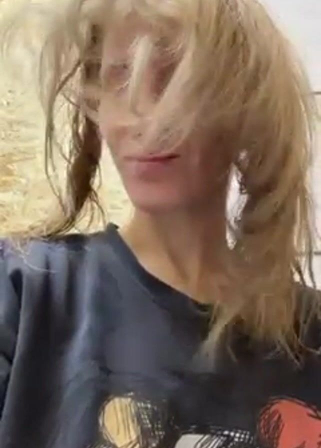 woman with fair skin and blonde hair that appears wet and somewhat disheveled, standing indoors. She is wearing a dark-colored sweatshirt with a graphic design. The background is a wall made of light-colored paneling. The woman's head is tilted slightly, and she seems to be looking at something off-camera. The overall impression is casual and unposed.